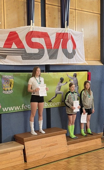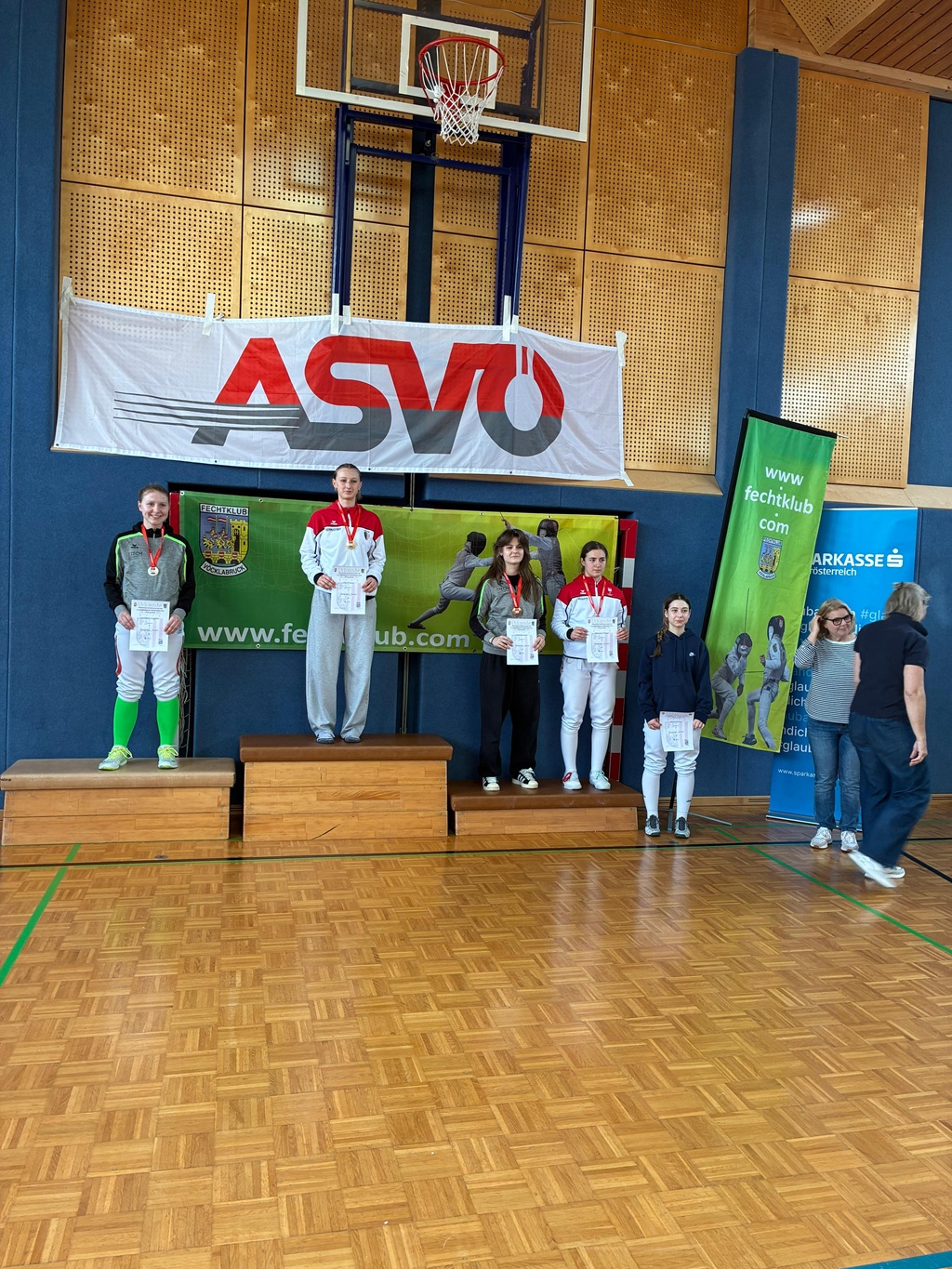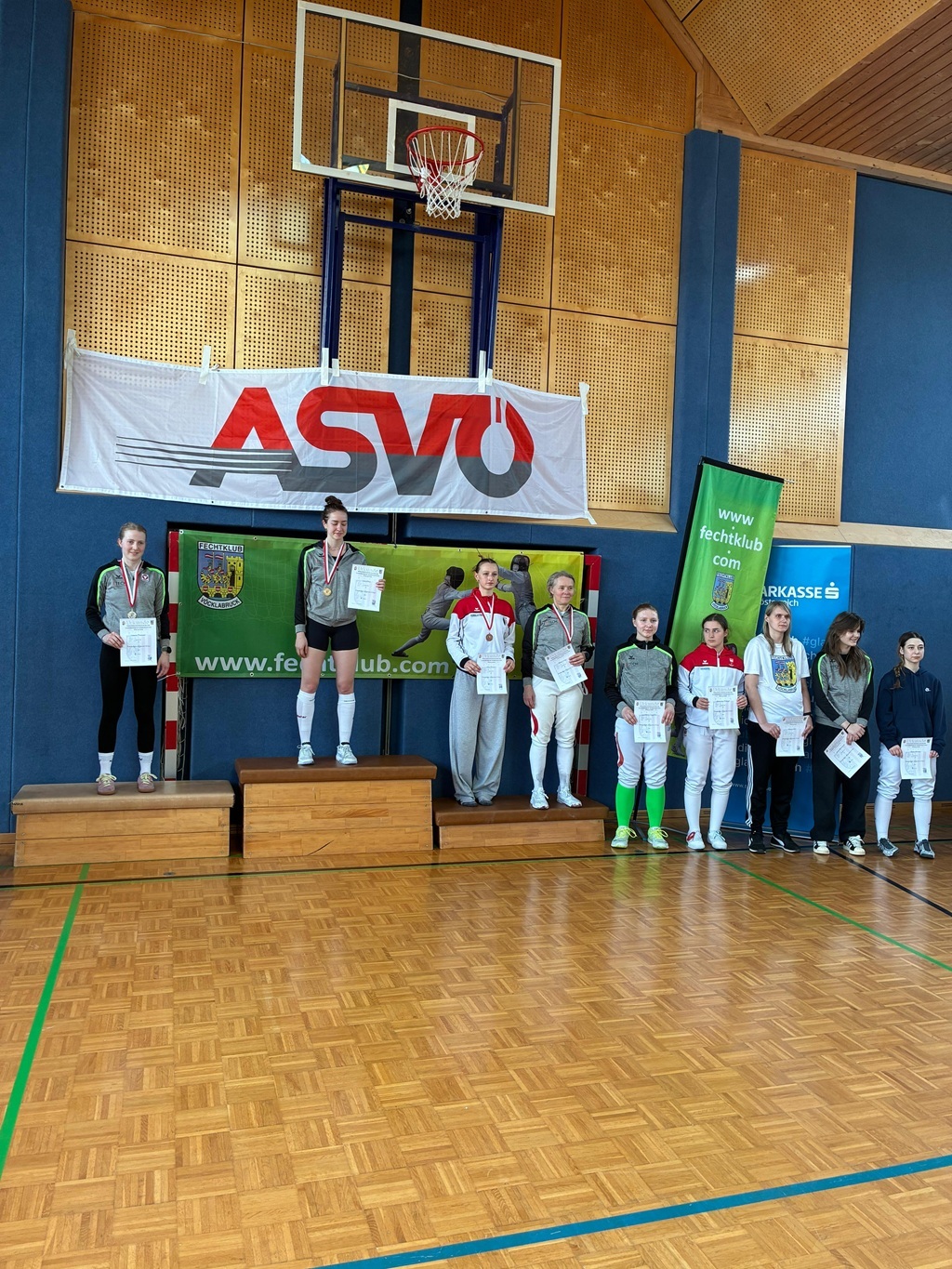 Leonore focht mit 6 Siegen einen makellose Vorrunde, Luise war mit nur einer Niederlage ebenfalls für die Direkte topgesetzt. In der darauffolgenden Direktausscheidung eliminierten dann beide Degenfechterinnen ihre Gegnerinnen teilweise überlegen und erreichten problemlos die Top-8. Leider verloren dann sowohl Leonore als auch Luise ihre beiden nächsten Gefechte und so wurden es die tollen Plätze 5 (Leonore) und 7(Luise) unter 83 Starterinnen im Endklassement.
